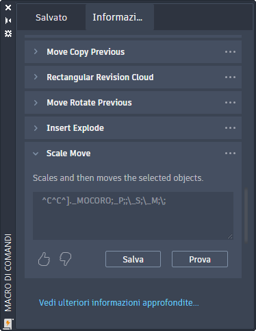 Salva: aggiunge le informazioni approfondite sulle macro come macro di comandi alla scheda Salvato da cui è possibile utilizzarla.