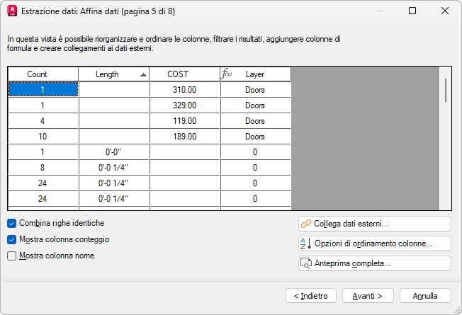 È possibile estrarre informazioni dagli oggetti, quali attributi dei blocchi e proprietà del disegno, per creare una pianificazione, un elenco di parti o una distinta dei materiali.