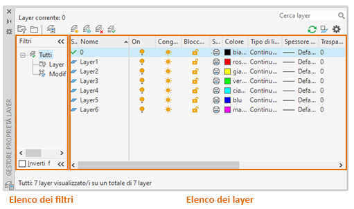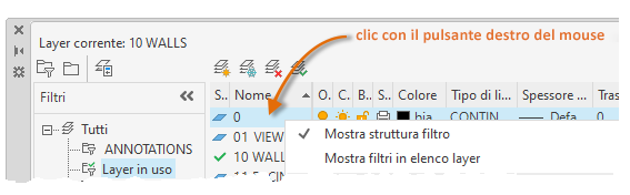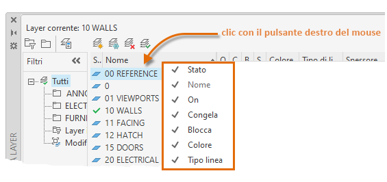 Imposta il layer selezionato come layer corrente. I nuovi oggetti vengono creati automaticamente sul layer corrente. (variabile di sistema CLAYER)