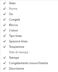 Elenca tutte le colonne in base al nome. Un segno di spunta indica che la colonna è inclusa nella visualizzazione. Fare clic su un nome di colonna per visualizzare o nascondere la colonna. Le opzioni Congelamento finestra, Colore finestra, Tipo linea finestra, Spessore linea finestra e Stile stampa finestra sono disponibili solo quando è attiva una finestra di layout.