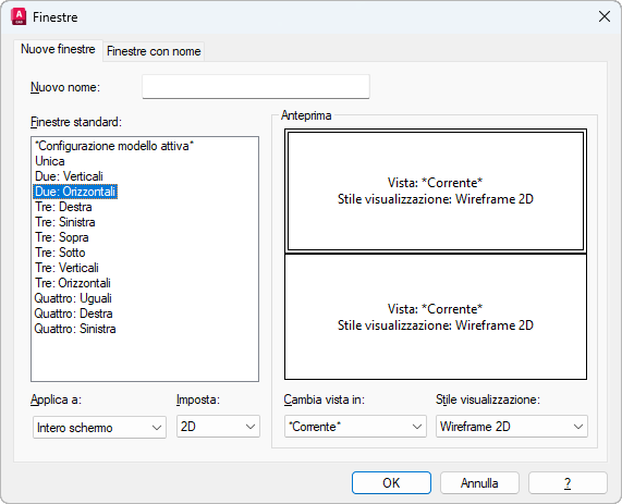 Definisce un'impostazione 2D o 3D. Se si seleziona 2D, la nuova configurazione di finestra viene creata inizialmente con la vista corrente in tutte le finestre. Se si seleziona 3D, un gruppo di viste 3D standard ortogonali viene applicato alle finestre nella configurazione.