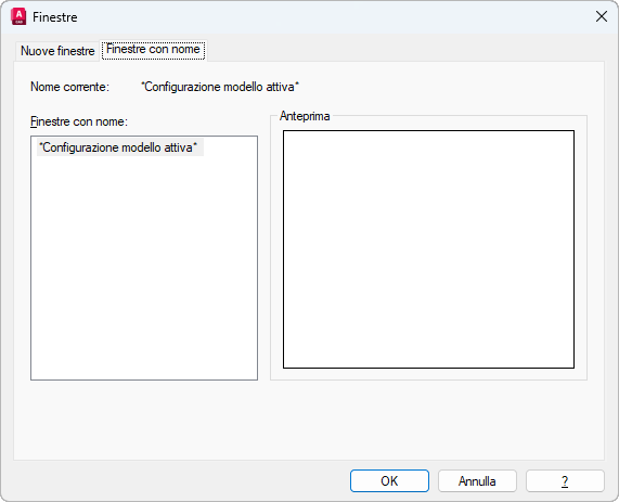 Consente di visualizzare tutte le configurazioni di finestre dello spazio modello salvate con nome in modo da poterle utilizzare nel layout corrente. Non è possibile salvare con nome una configurazione di finestre di layout.