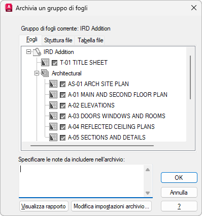 Elenca i fogli da includere nel pacchetto di archivio, in ordine di foglio e in base all'organizzazione dei sottogruppi. È necessario aprire un foglio in Gestione gruppo di fogli. È possibile selezionare Archivia dal menu di scelta rapida visualizzato quando si fa clic con il pulsante destro del mouse sul nodo di livello superiore del gruppo di fogli oppure immettere ARCHIVIA alla riga di comando.