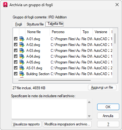 Visualizza i file da includere nel pacchetto di archivio in un formato tabella. Per default, vengono elencati tutti i file associati al disegno corrente (quali rimandi, stili di stampa e font correlati). È possibile aggiungere altri file al pacchetto di archivio o rimuovere quelli esistenti. I file correlati a cui viene fatto riferimento tramite URL non vengono inclusi nel pacchetto di archivio.