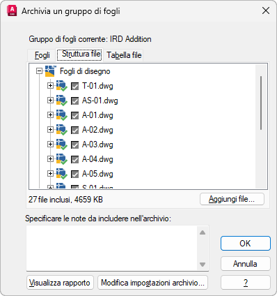 Elenca i file da includere nel pacchetto di archivio in un formato a struttura gerarchica. Per default, vengono elencati tutti i file associati al disegno corrente (quali rimandi, stili di stampa e font correlati). È possibile aggiungere altri file al pacchetto di archivio o rimuovere quelli esistenti. I file correlati a cui viene fatto riferimento tramite URL non vengono inclusi nel pacchetto di archivio.