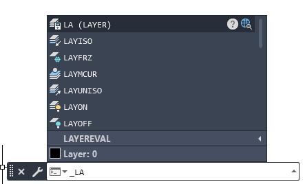 Per default, il nome del comando o della variabile di sistema viene completato automaticamente durante la digitazione. Viene visualizzato anche un elenco di suggerimenti per comandi e variabili di sistema che utilizzano le stesse lettere. È possibile controllare le impostazioni di queste funzionalità nella finestra di dialogo Opzioni di ricerca input.