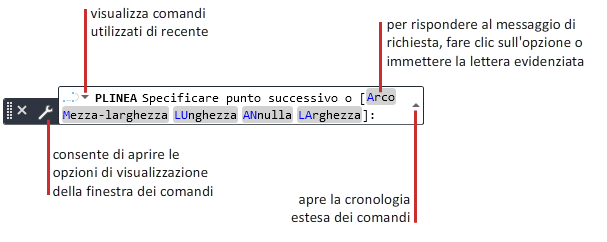 La finestra dei comandi, che è possibile ancorare o ridimensionare, accetta comandi e variabili di sistema e visualizza i messaggi di richiesta che forniscono assistenza per completare una sequenza di comandi (inclusi i comandi che sono stati avviati da un'altra posizione, ad esempio la barra multifunzione).