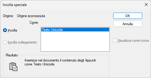 Incolla il contenuto degli Appunti nel disegno corrente come oggetto incorporato.
