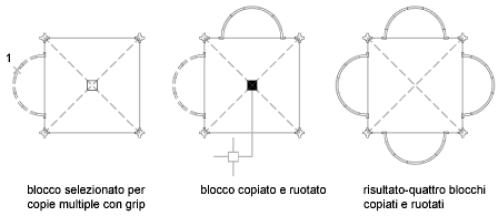 Allo stesso modo, con uno snap di rotazione è possibile posizionare più copie di un oggetto ad intervalli angolari che si irradiano da un grip di base. Lo snap di rotazione viene definito dal valore dell'angolo tra un oggetto e la sua prima copia quando si utilizza la modalità grip Ruota. Per utilizzare lo snap di rotazione, tenere premuto CTRL.