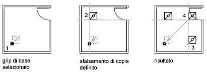 Per eseguire più copie, tenere premuto CTRL durante la selezione del primo punto. Ad esempio, nella modalità grip Stira, è possibile stirare un oggetto, quale una linea, quindi copiarlo in qualsiasi punto dell'area di disegno. La creazione di copie prosegue fino a quando non vengono disattivati i grip.