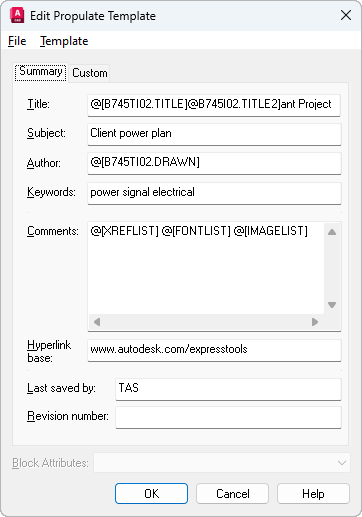 Utilizzando un modello predefinito, l'Express Tool PROPULATE può inserire i dati relativi alle proprietà del disegno nelle cartelle dei disegni. Le informazioni applicabili includono stringhe letterali, valori di attributo estratti dai blocchi con attributi specificati ed elenchi di immagini, font e riferimenti esterni collegati. Si supponga, ad esempio, di avere un'intera cartella di progetto contenente disegni che utilizzano lo stesso cartiglio con attributi. Se si utilizza PROPULATE e un modello personalizzato, i valori di attributo di ogni cartiglio in ciascun disegno possono essere estratti e aggiunti alla finestra di dialogo Proprietà del disegno corrispondente. L'Express Tool PROPULATE può inoltre inserire nel campo Commenti l'elenco dei riferimenti esterni, delle immagini e dei font utilizzati da ciascun disegno.
