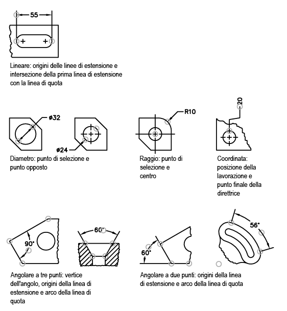 Nell'illustrazione che segue vengono indicati i punti di definizione per ciascun tipo di quota. Anche il punto medio del testo di quota è un punto di definizione per tutti i tipi di quota.