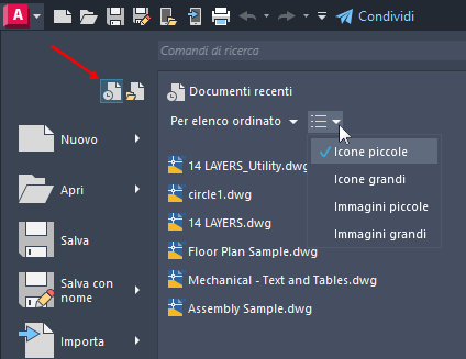 Nota: L'opzione di visualizzazione selezionata viene applicata ad entrambi gli elenchi Documenti recenti e Documenti aperti nel menu dell'applicazione.