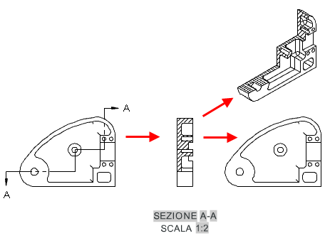 Come da qualsiasi altra vista 2D, è possibile generare viste proiettate da una vista in sezione. Tuttavia, solo le viste proiettate assonometriche ereditano il taglio per default. Le viste proiettate ortogonali non ereditano il taglio. Di conseguenza, la vista proiettata ortogonale di una vista in sezione è una vista completa.