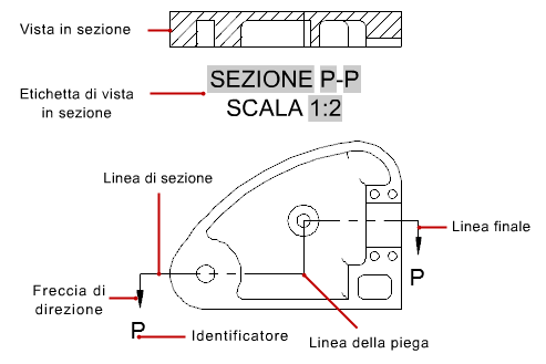 Una vista in sezione della documentazione modello è una vista proiettata da una vista 2D esistente, in cui viene utilizzata una linea di sezione per tagliare la vista 2D in modo da visualizzare gli elementi presenti all'interno.