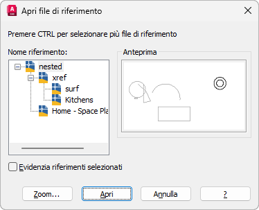 Chiude temporaneamente la finestra di dialogo Apri file di riferimento ed esegue lo zoom del riferimento selezionato nell'area di disegno. Premere Invio per visualizzare di nuovo la finestra di dialogo.