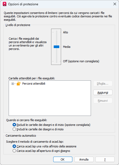 Controlla il livello di limitazione al percorso per i file eseguibili e se viene visualizzata una finestra di dialogo di avvertimento. (Variabile di sistema SECURELOAD)