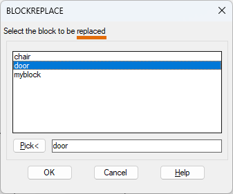 BLOCKREPLACE esegue la ricerca di un blocco specificato nell'intero disegno e lo sostituisce con un altro blocco specificato. Dopo la sostituzione, è possibile utilizzare il comando ELIMINA per eliminare dal disegno la definizione di blocco senza riferimento.