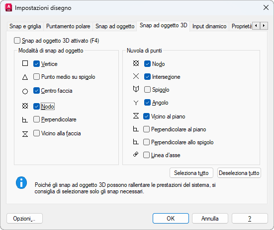 Attiva e disattiva le modalità snap ad oggetto 3D. I singoli snap ad oggetto 3D selezionati nell'area Modalità di snap ad oggetto 3D sono attivi quando è attivo lo snap ad oggetto. (variabile di sistema 3DOSMODE)