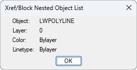 Se si seleziona l'oggetto, viene visualizzata la finestra di dialogo Xref/Block Nested Object List con le informazioni sulle proprietà mostrate: