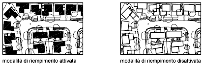 Quando si disattiva la modalità di riempimento, gli oggetti elencati vengono visualizzati come contorni. Ad eccezione dei modelli di tratteggio e dei riempimenti sfumati, il riempimento solido viene disattivato automaticamente per la vista nascosta e per la vista 3D.