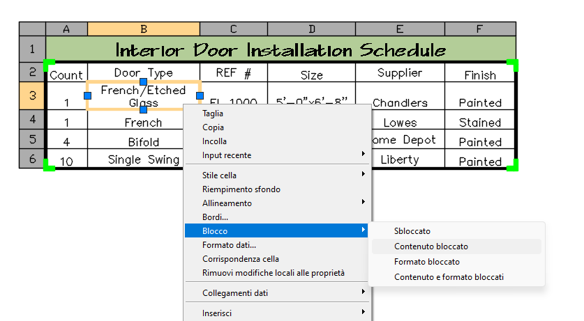 Per default, tutte le celle di una tabella di estrazione dati sono bloccate e non possono essere modificate ma sono sbloccate ai fini della formattazione. È possibile sbloccarle o bloccarle per consentire la modifica a livello di dati e di formattazione attraverso il menu di scelta rapida della tabella.