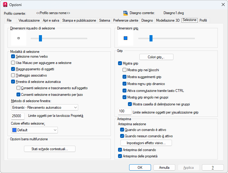 Visualizza l'anteprima di selezione quando non sono attivi comandi. (Variabile di sistema SELECTIONPREVIEW)
