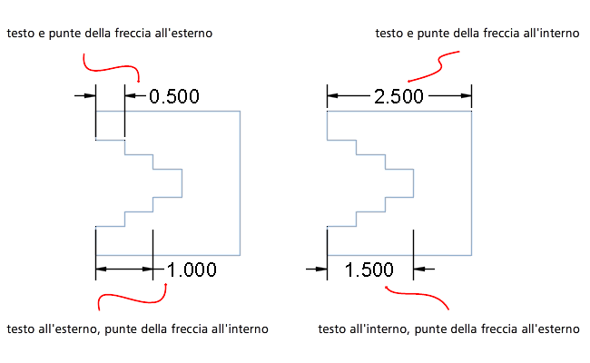 Se lo spazio è sufficiente, il testo di quota e le punte della freccia solitamente vengono visualizzati tra le linee di estensione. Se lo spazio non è sufficiente, è possibile specificare le modalità di posizionamento di questi elementi.