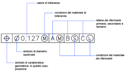Un riquadro delle tolleranze è composto da almeno due sezioni. La prima cornice di controllo contiene un simbolo che rappresenta la caratteristica geometrica alla quale viene applicata la tolleranza, ad esempio la posizione, il profilo, la forma, l'orientamento o l'eccentricità. Le tolleranze di forma controllano la rettilineità, la planarità, la circolarità, la cilindricità ed i profili di linea e superficie. Nella figura, la caratteristica è la posizione.