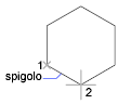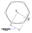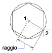 Se si specifica il raggio con il dispositivo di puntamento, vengono determinate la rotazione e le dimensioni del poligono. Se si specifica il raggio digitando un valore, il lato inferiore del poligono viene disegnato con l'angolo di rotazione dello snap corrente.