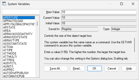 | Initial Value | Visualizza il valore iniziale della variabile di sistema evidenziata nella casella di riepilogo. Questo è il valore della variabile di sistema in un nuovo disegno. |