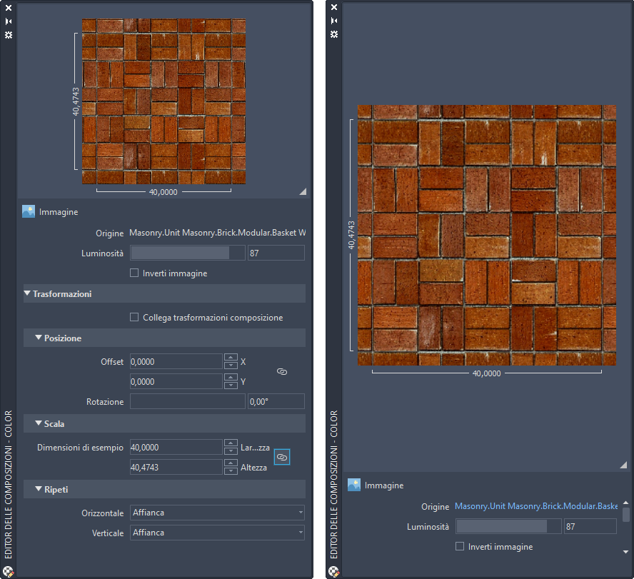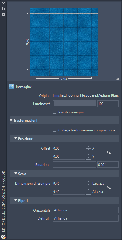 Se si desidera che le modifiche delle proprietà relative a posizione, scala e ripetizione apportate alla composizione corrente vengano applicate ad altre composizioni nello stesso materiale, selezionare Collega trasformazioni texture.