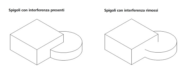 Attiva o disattiva la visibilità degli spigoli con interferenza. Gli spigoli con interferenza si verificano quando uno o più corpi solidi si intersecano. Quando la visibilità degli spigoli con interferenza è attivata, viene disegnata una linea nel punto in cui i corpi solidi si incontrano.