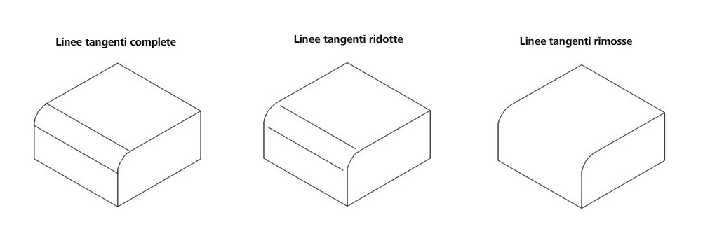 Attiva o disattiva la visibilità degli spigoli tangenti. Gli spigoli tangenti contrassegnano la transizione tra una superficie piana e uno spigolo arrotondato, più comunemente visti come spigoli raccordati.
