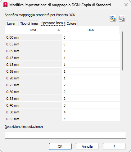 Viene visualizzato un gruppo di spessori di linea predefiniti che garantiscono la corrispondenza migliore tra gli spessori utilizzati nei file DGN e DGW. È possibile copiare e incollare uno o più spessori di linea contemporaneamente utilizzando il menu contestuale accessibile dalla colonna di destra. È possibile apportare modifiche solo nella colonna destra della scheda Spessore di linea. La colonna di sinistra non può essere modificata.