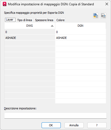 Nuova impostazione di mappaggio: se si è eseguito l'accesso alla finestra di dialogo Modifica impostazione di mappaggio DGN mediante la creazione di una nuova impostazione di mappaggio dalle finestre di dialogo Importa/Esporta impostazioni DGN, le righe vengono compilate con tutti i livelli definiti nel file DGN importato o con tutti i layer definiti nel file di disegno corrente.