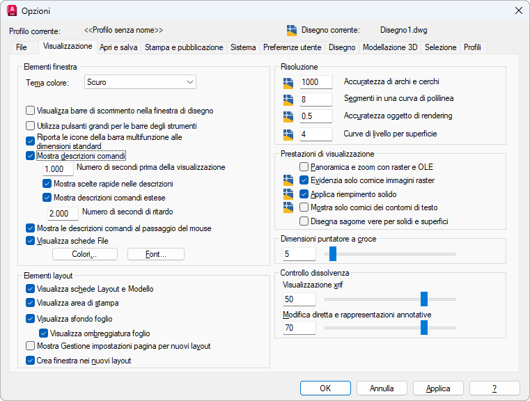 Controlla le impostazioni di visualizzazione specifiche dell'ambiente di disegno.