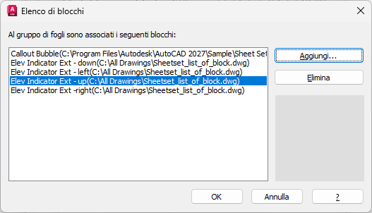 Per visualizzare questa finestra di dialogo, fare clic sul pulsante Aggiungi blocchi nella finestra di dialogo Categoria vista o sul pulsante [...] accanto a Blocchi vista dettaglio nella finestra di dialogo Proprietà gruppo di fogli.