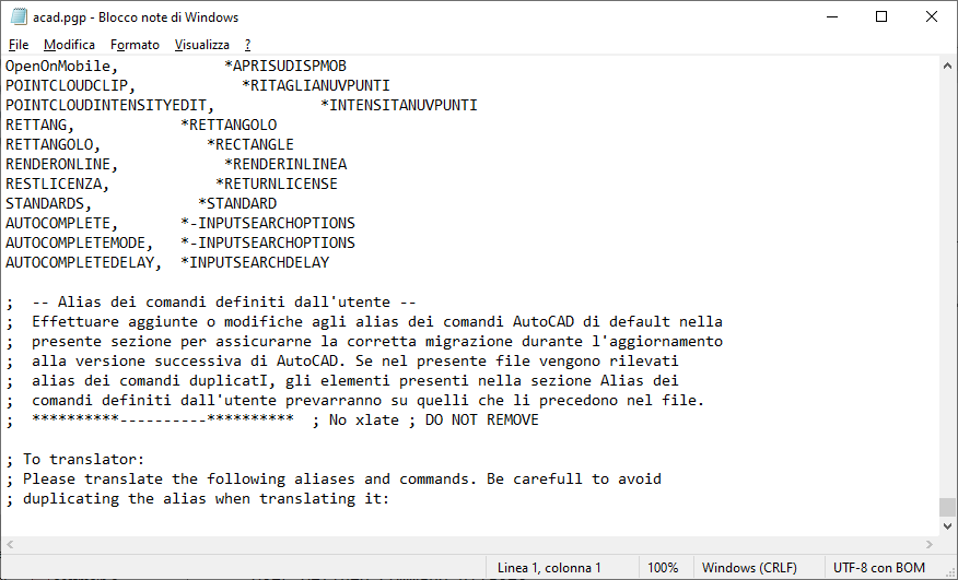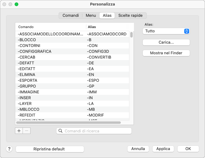 Nota: Le modifiche agli alias dei comandi vengono salvate nel file acaduser.pgp (o acadltuser.pgp per AutoCAD LT).