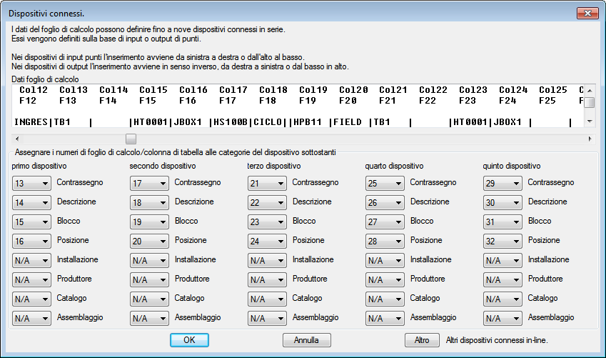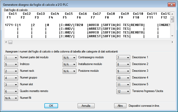 I requisiti I/O PLC di un progetto, nel formato foglio di calcolo o database, possono determinare la generazione automatica di disegni di schemi I/O.
