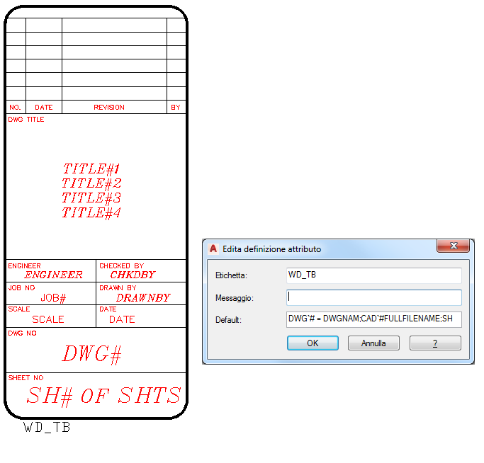 Con le informazioni di mappatura viene codificato un attributo invisibile in un cartiglio del disegno, denominato "WD_TB". Questo sistema elimina la necessità di un file di testo di mappatura esterno. Il formato è <nome attributo>=<LINEx>;<nome attributo>=<LINEx>. Di seguito è riportato un esempio del formato del valore dell'attributo WD_TB.