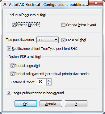 Nella finestra di dialogo Configurazione pubblicazione di AutoCAD Electrical toolset, selezionare PDF come tipo di pubblicazione.