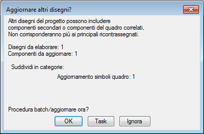 Viene visualizzata la finestra di dialogo Aggiornare altri disegni? Questa finestra di dialogo informa che gli altri disegni del progetto includono componenti secondari o componenti del quadro correlati.