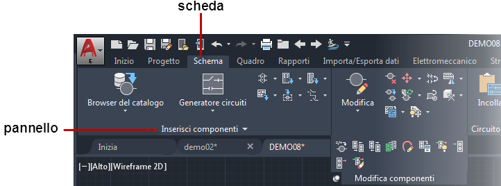 Generatore circuiti, Schema è il nome della scheda, Inserisci componenti è il nome del gruppo nella scheda e Generatore circuiti è il nome del comando.