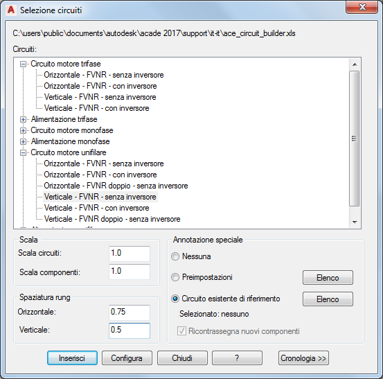Quando viene inserito un nuovo circuito, è possibile fare riferimento ad un circuito esistente selezionato da un elenco di circuiti tratto dal progetto attivo. I componenti, i valori, le descrizioni e le assegnazioni di contrassegni del circuito selezionato diventano quelli di default del nuovo circuito. I contrassegni vengono ricalcolati se l'opzione "Ricontrassegna nuovi componenti" è selezionata.