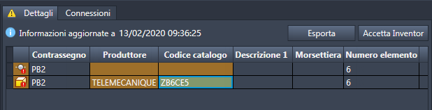 Se i dati di catalogo sono aggiornati, fare clic su Sì per aggiornare tutti i valori associati quali PROD, macrocodice, codice catalogo, rating, elenco pin, numero dell'elemento, layout componente del quadro e descrizione del componente selezionato.