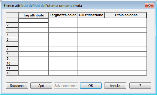 (Facoltativo) Specificare la larghezza, la giustificazione e il titolo della colonna relativa all'attributo per consentire la generazione dei rapporti. Se non viene specificato alcun valore, verranno utilizzati i seguenti valori di default.