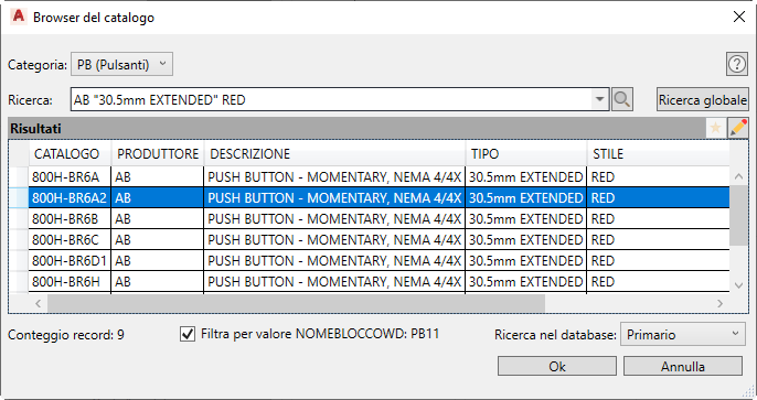 Fare clic su Ricerca globale per trovare valori di codice catalogo, produttore o assieme specifici in diverse tabelle della famiglia. Ad esempio, il record Pulsante illuminato può essere comune nelle tabelle PB (Pulsanti) e LT (Spie). Con questa funzionalità, è possibile verificare se esiste già un record, impedendo in tal modo voci duplicate.