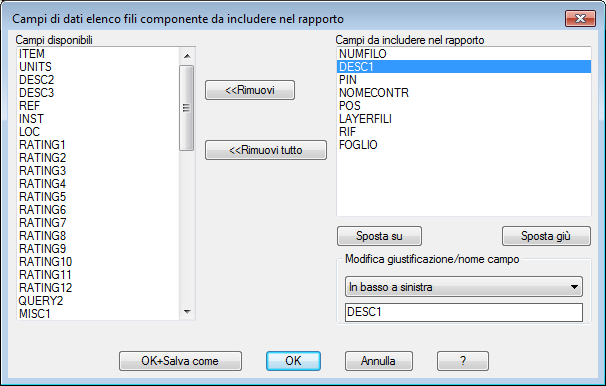 Desc1 viene spostato nell'elenco Campi da includere nel rapporto. Si tratta dei campi da visualizzare nel rapporto relativo ai componenti.