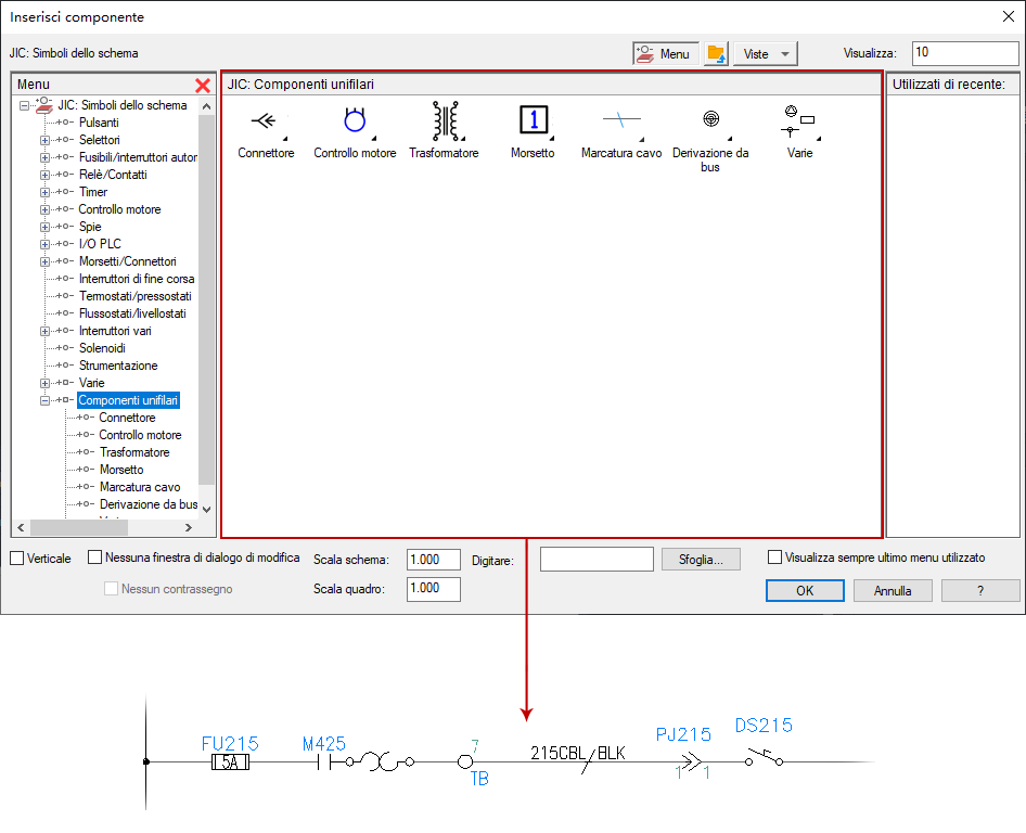 I simboli unifilari seguono la stessa convenzione di denominazione dei simboli principali e secondari dello schema. Per rendere univoci i nomi dei simboli, i nomi dei blocchi di simboli unifilari sono seguiti dal suffisso "1-". Tuttavia, il nome del simbolo non definisce il simbolo come unifilare. Un simbolo unifilare è definito dall'esistenza di un attributo TIPOWD con valore "1-" sul simbolo o con un valore "1-1" per un simbolo di derivazione da bus unifilare.
